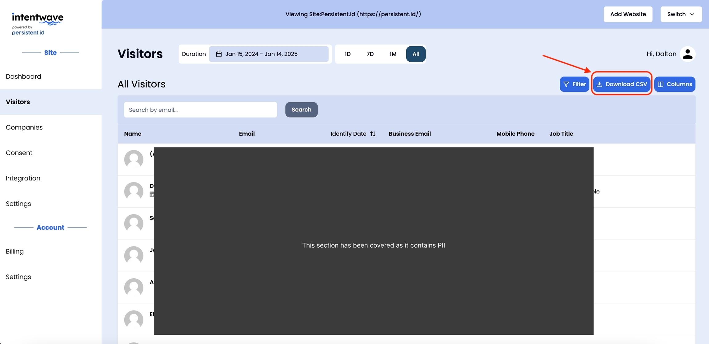 If you need to transfer visitor or company information to another CRM platform, you can directly export the CSV from the Visitor and Company page by clicking the Download CSV button.
