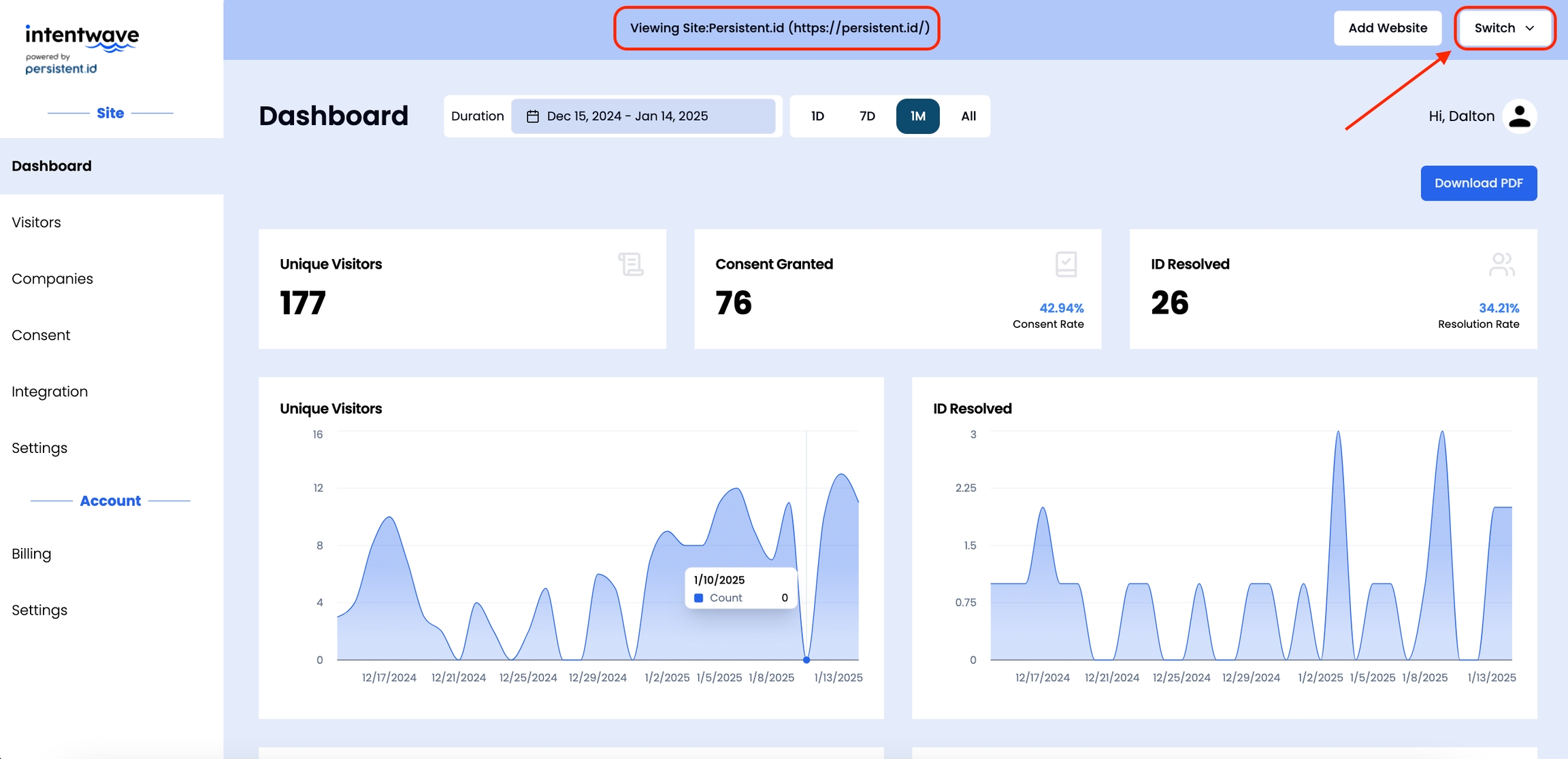 Managing multiple client accounts can be frustrating when you need to log in and out repeatedly. Intentwave offers a simple solution: easily switch between different accounts by selecting the client dashboard you want to view from the dropdown menu. Say goodbye to tedious account management!