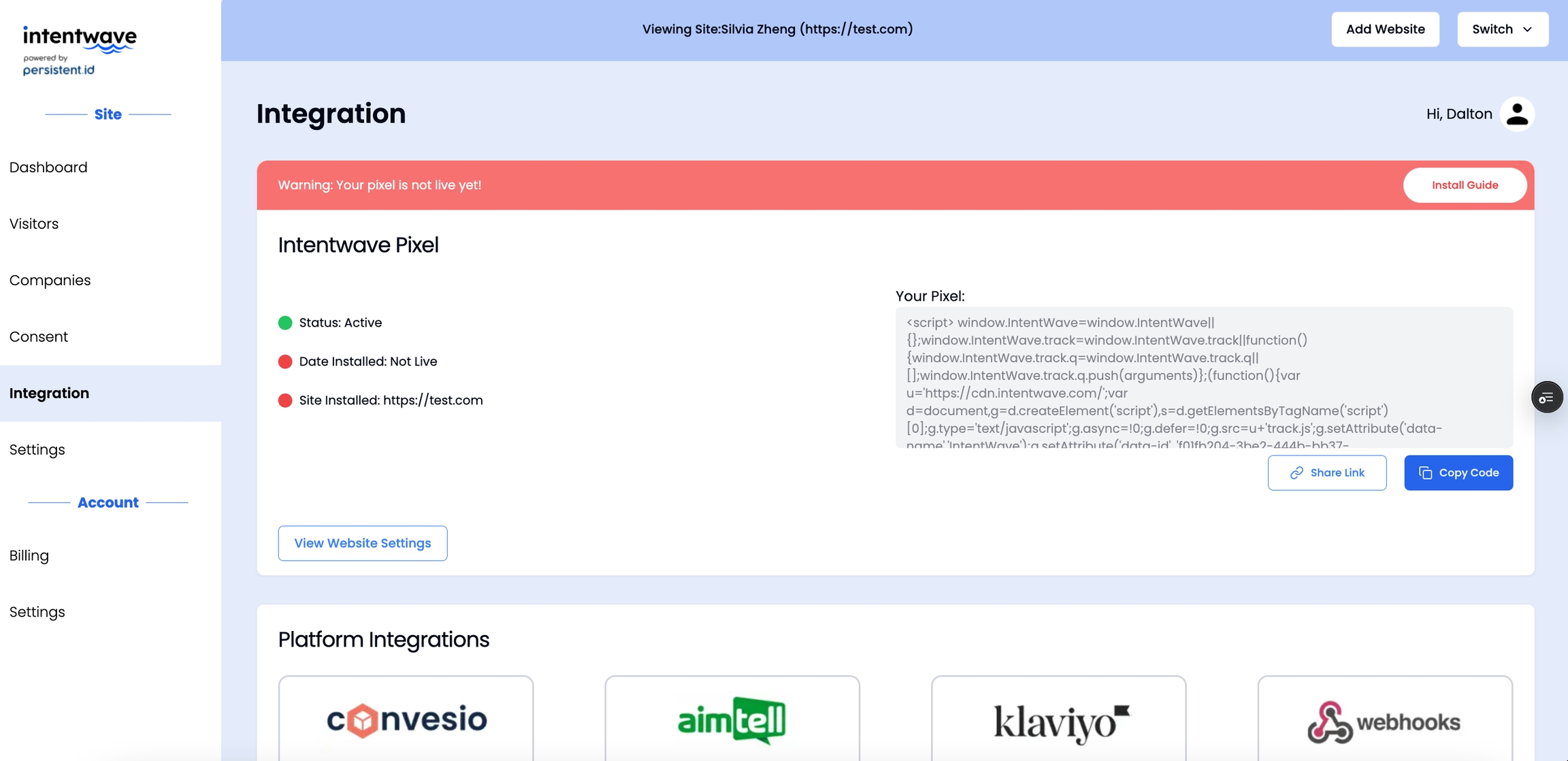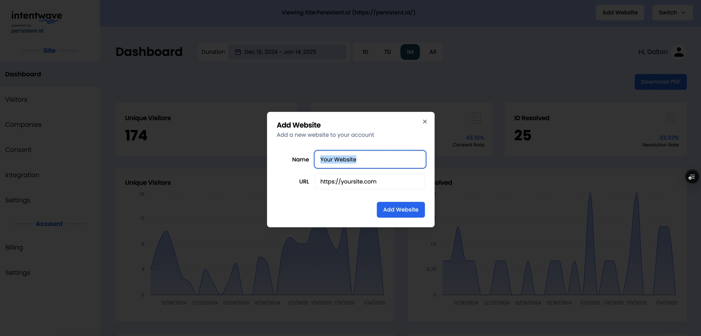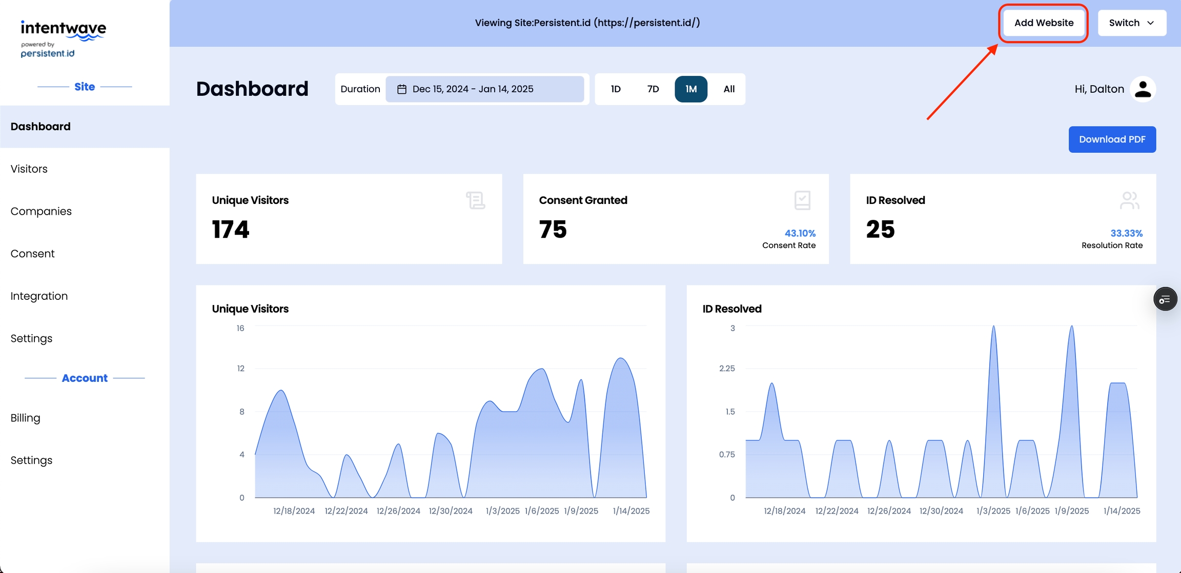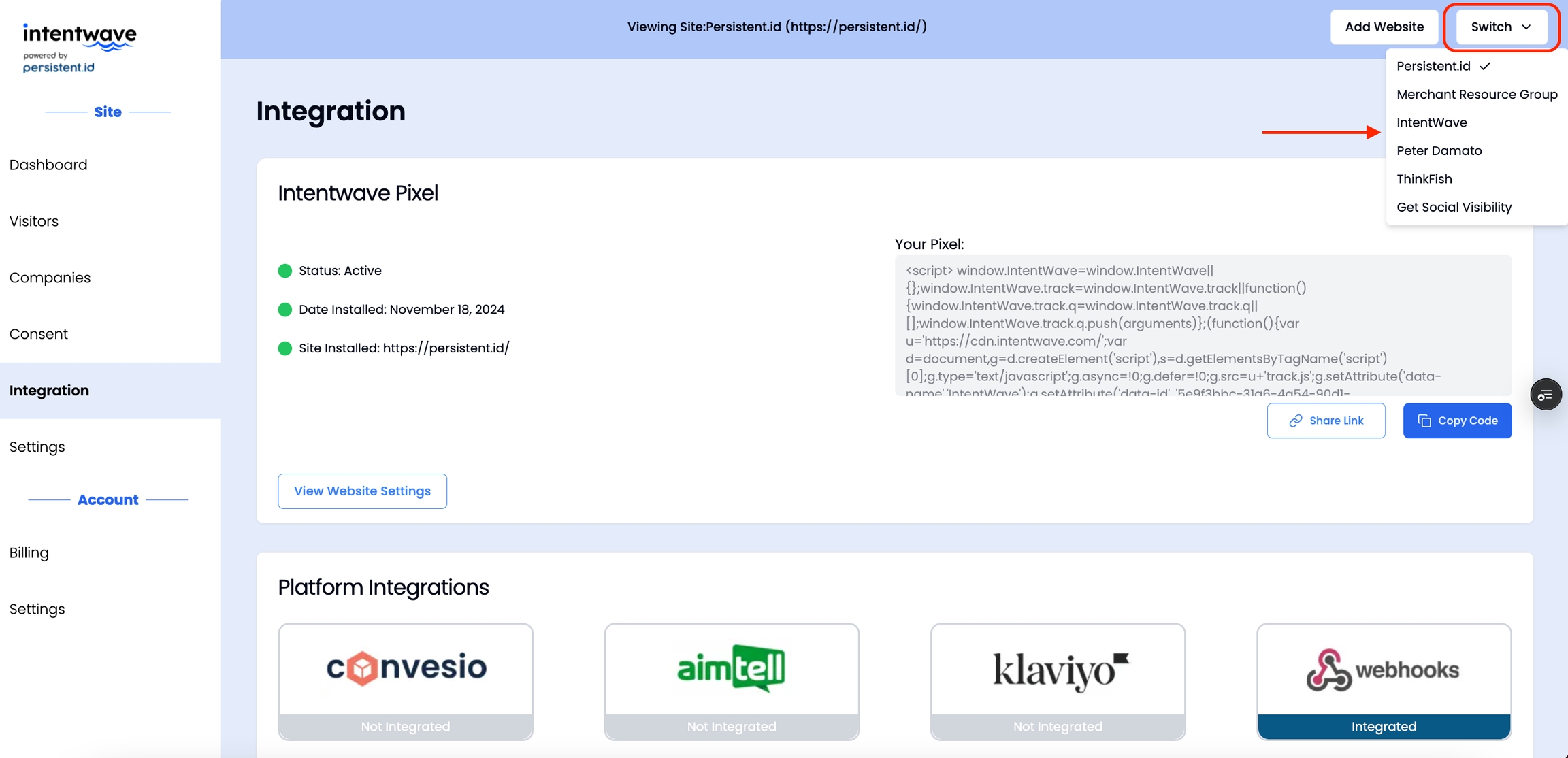 Intentwave offers an easy and intuitive way to add new websites or switch between them, allowing you to manage everything under the same account. We empower you to accomplish more with less effort!